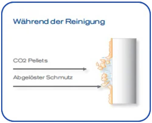 Trockeneispellets werden mit Druckluft stark beschleunigt und gezielt auf die Oberfläche gestrahlt.